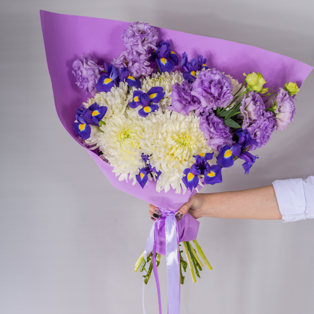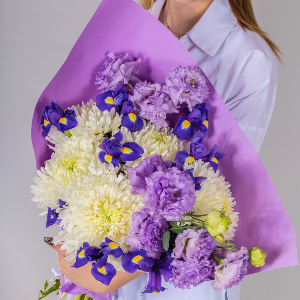 Букет из белых одноголовых хризантем с эустомой и ирисами арт. 52705