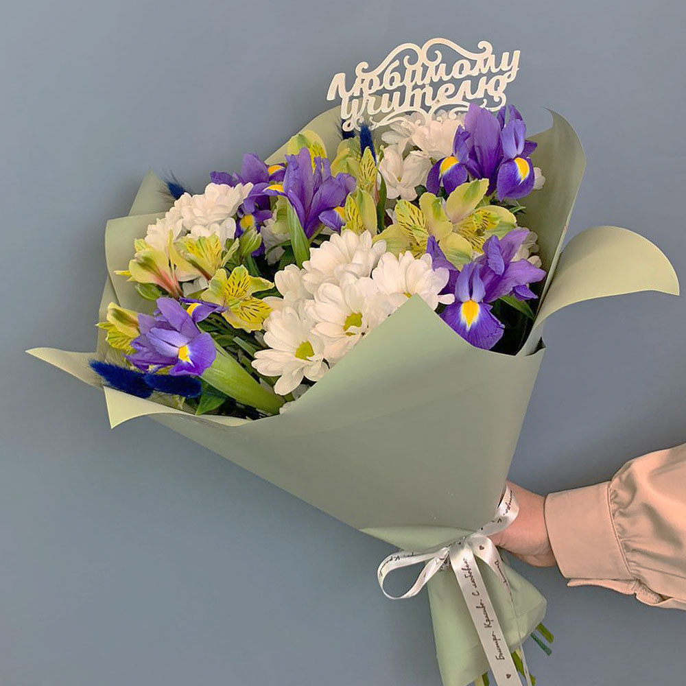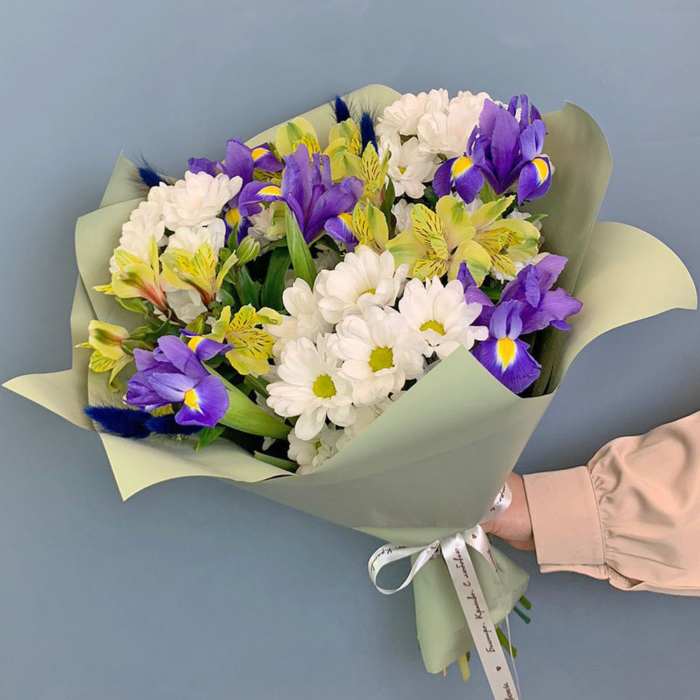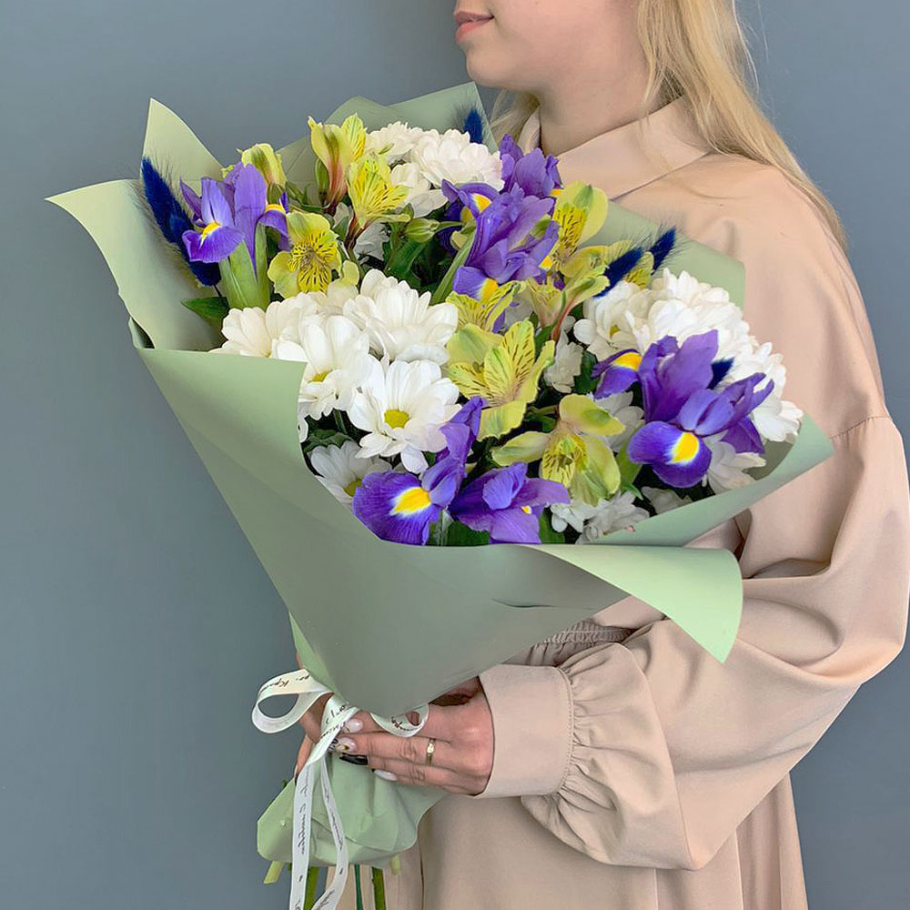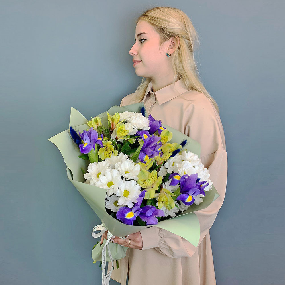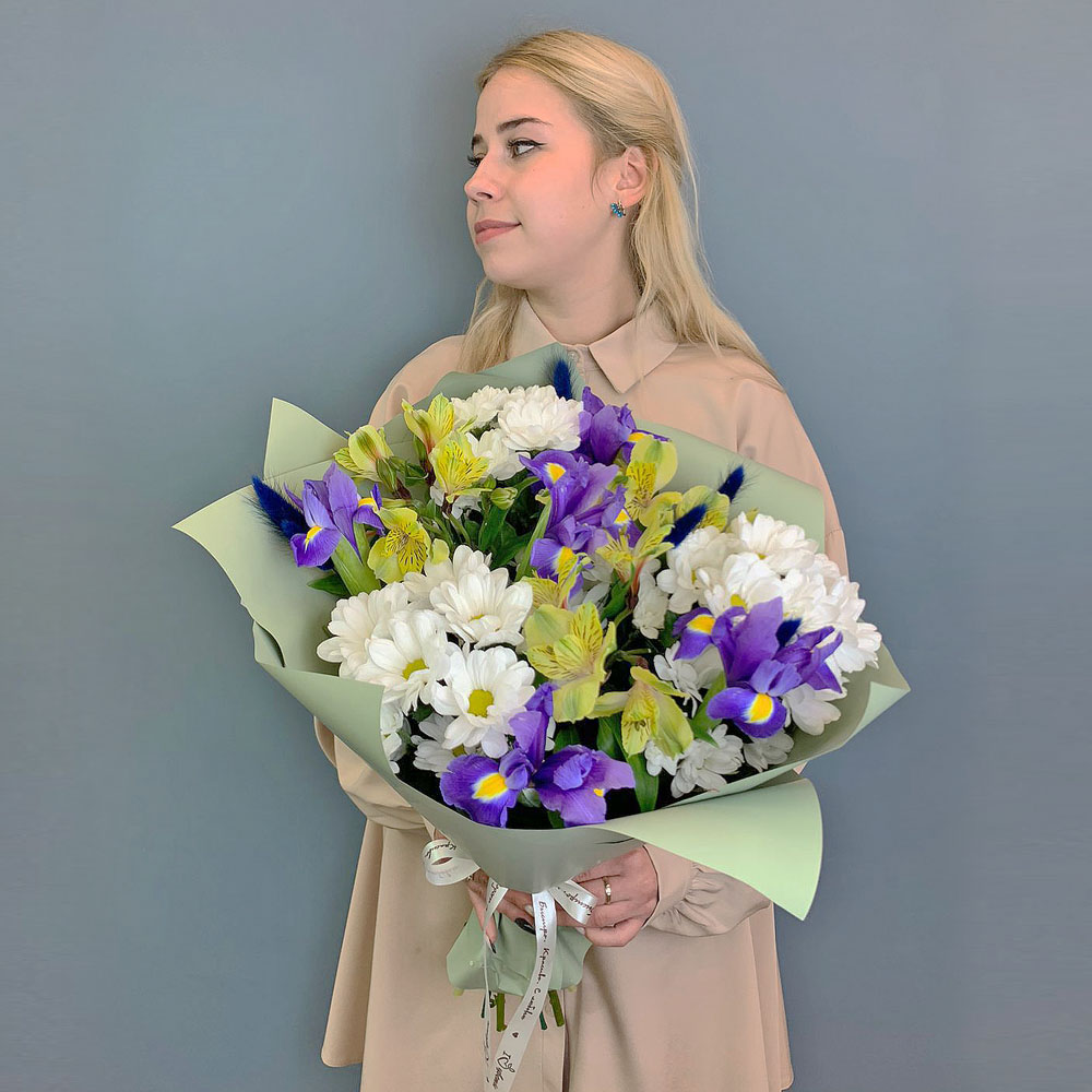 Букет из хризантем с ирисами и желтой альстромерией N 67002-Ж