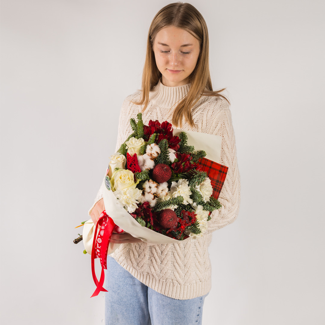 Такой букет с елкой подойдёт как поздравление на Новый год для мамы, подруги, коллеги или в качестве тёплой благодарности человеку, которому хочется сказать «я о тебе помню». Он уместен и дома, и в офисе, легко заменяет классический праздничный декор и сразу создаёт ощущение праздника в любой обстановке.