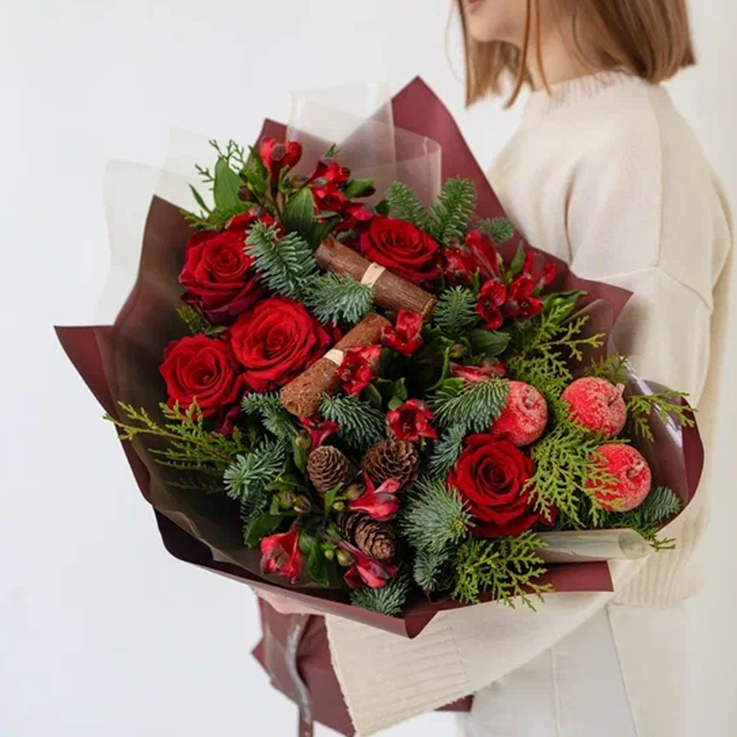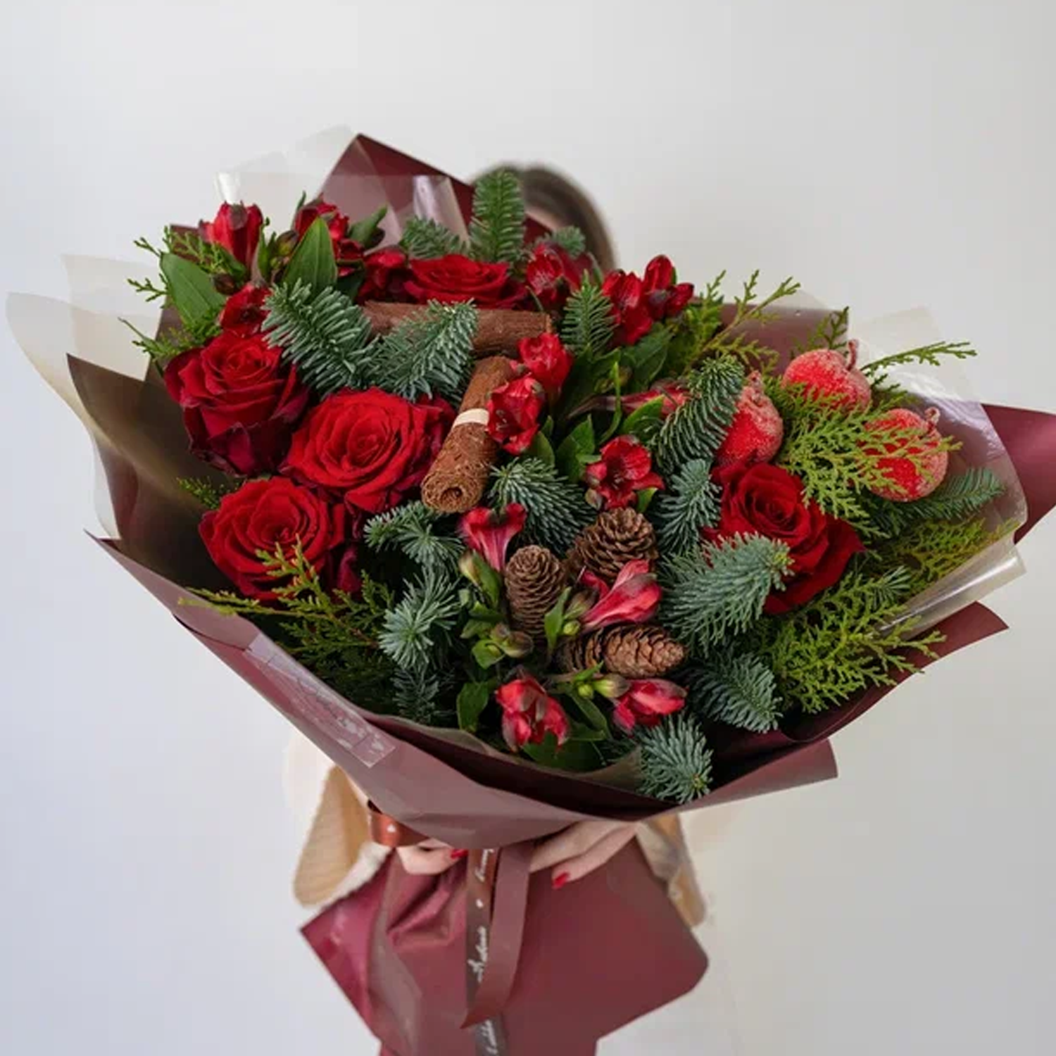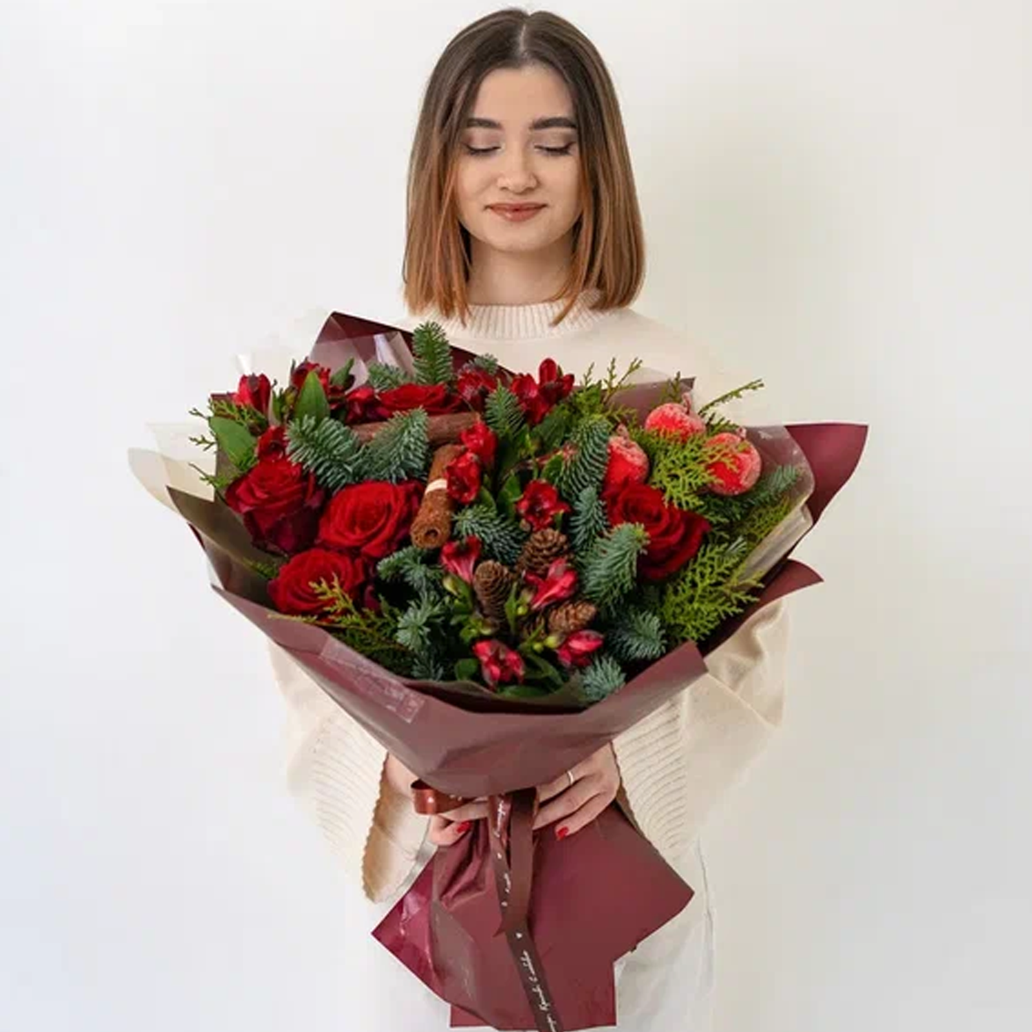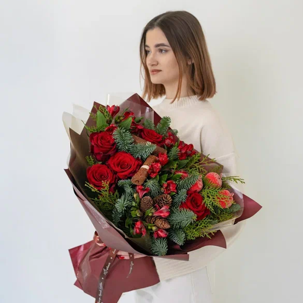 Чтобы розы и еловые ветки дольше оставались свежими, подрежьте стебли, поставьте букет в чистую прохладную воду и держите подальше от батарей и прямого солнца. Хвоя нобилиса долго не осыпается. Такие цветы с доставкой удобно заказать прямо сейчас, и зимний букет будет у вас уже сегодня.