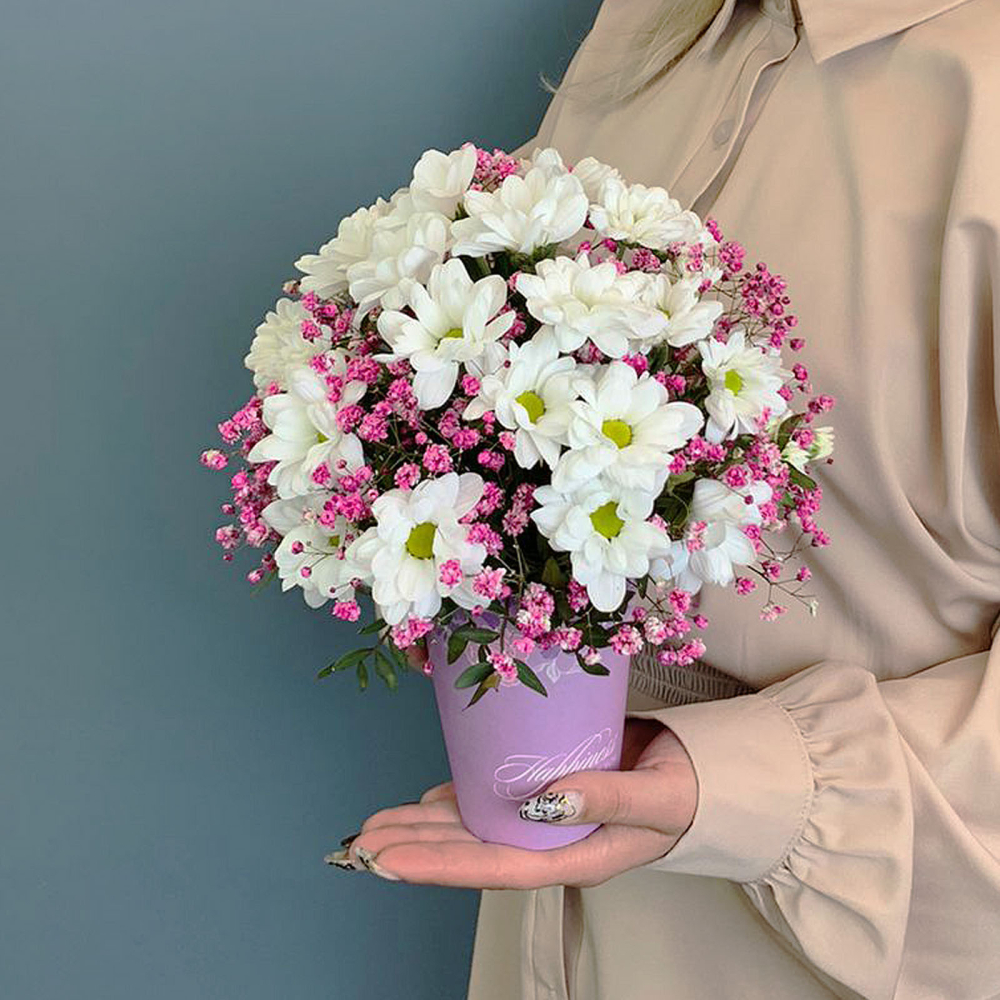Цветы в стаканчике станут уместным выбором как букет на 1 сентября, так и для Дня воспитателя или в качестве тёплого комплимента «просто так». Мини-формат делает подарок особенно элегантным и нестандартным, ведь он легко вписывается в школьную атмосферу и не перегружает ребёнка. Нежные ромашковые хризантемы символизируют искренность и чистоту, а гипсофила добавляет воздушности и праздничного настроения.