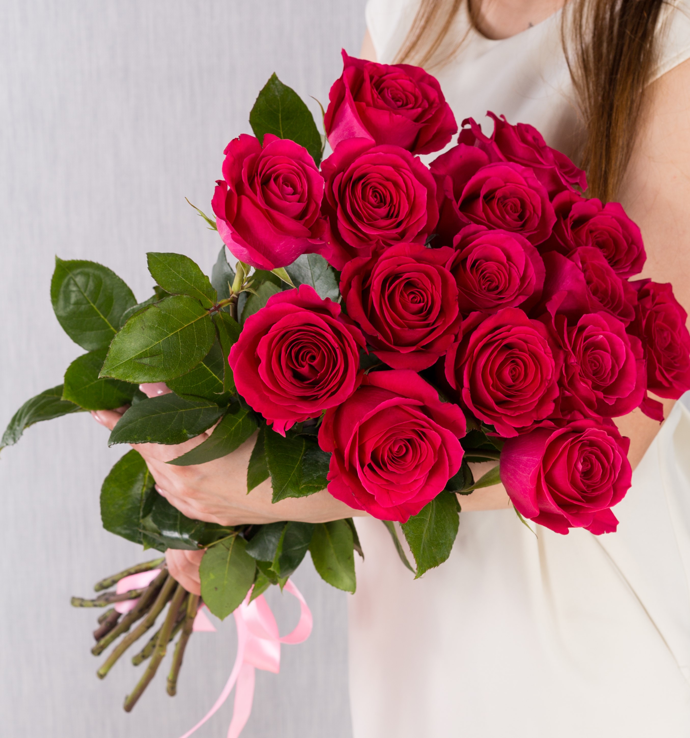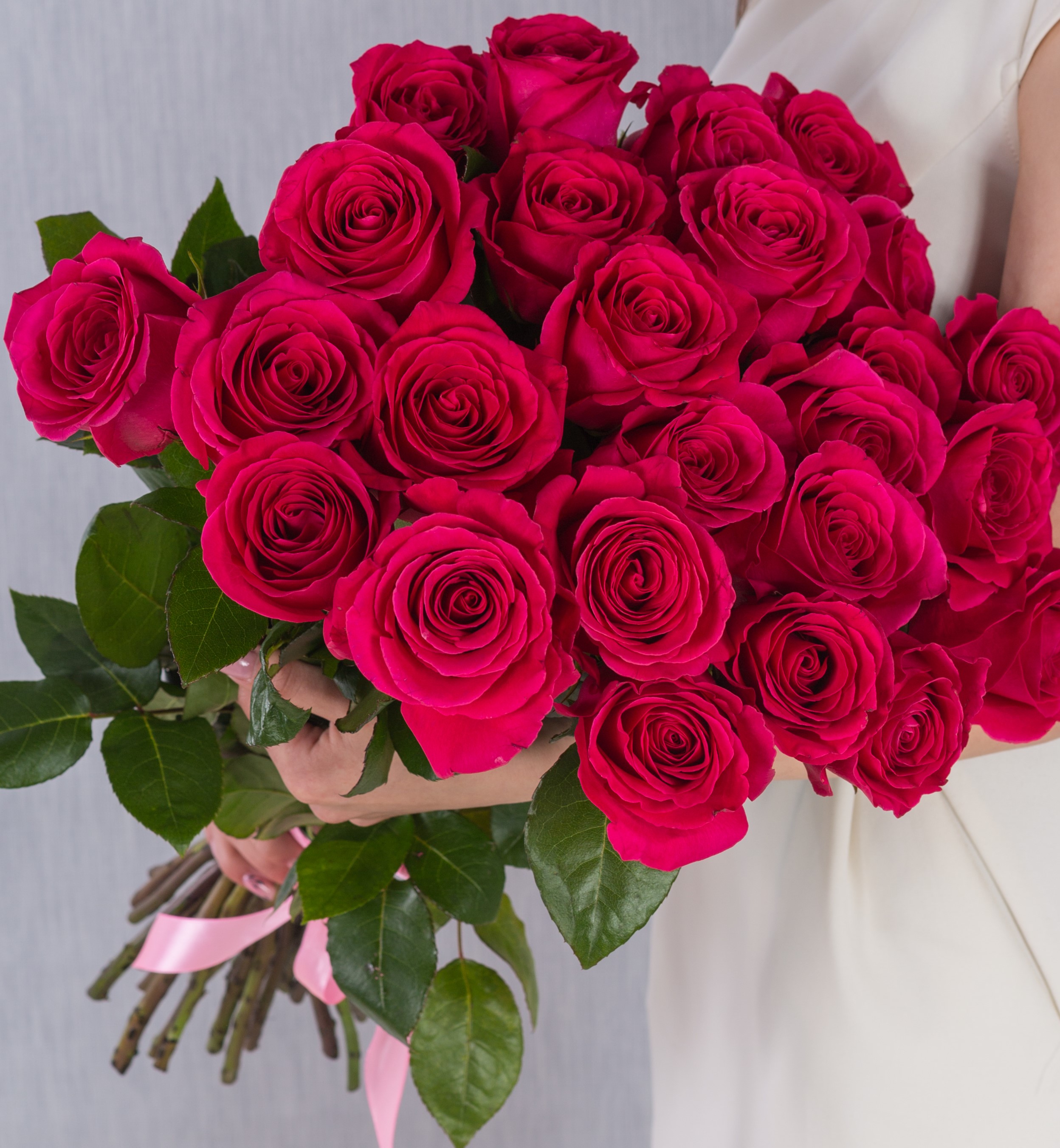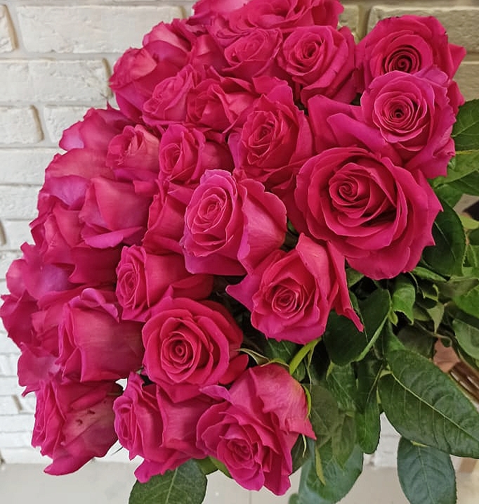 Розовые розы особенно хороши в больших моно-букетах от 15 штук - они создают пышный, визуально значимый объём. Это удачный выбор для поздравления мамы, подруги, коллеги или любимого человека. Также они идеально подходят для букета от класса на 1 сентября: каждый ребёнок дарит по одной розе, и у учителя получается цельная и торжественная композиция. Цветок имеет лёгкий, едва уловимый аромат и подойдёт даже тем, кто чувствителен к запахам.