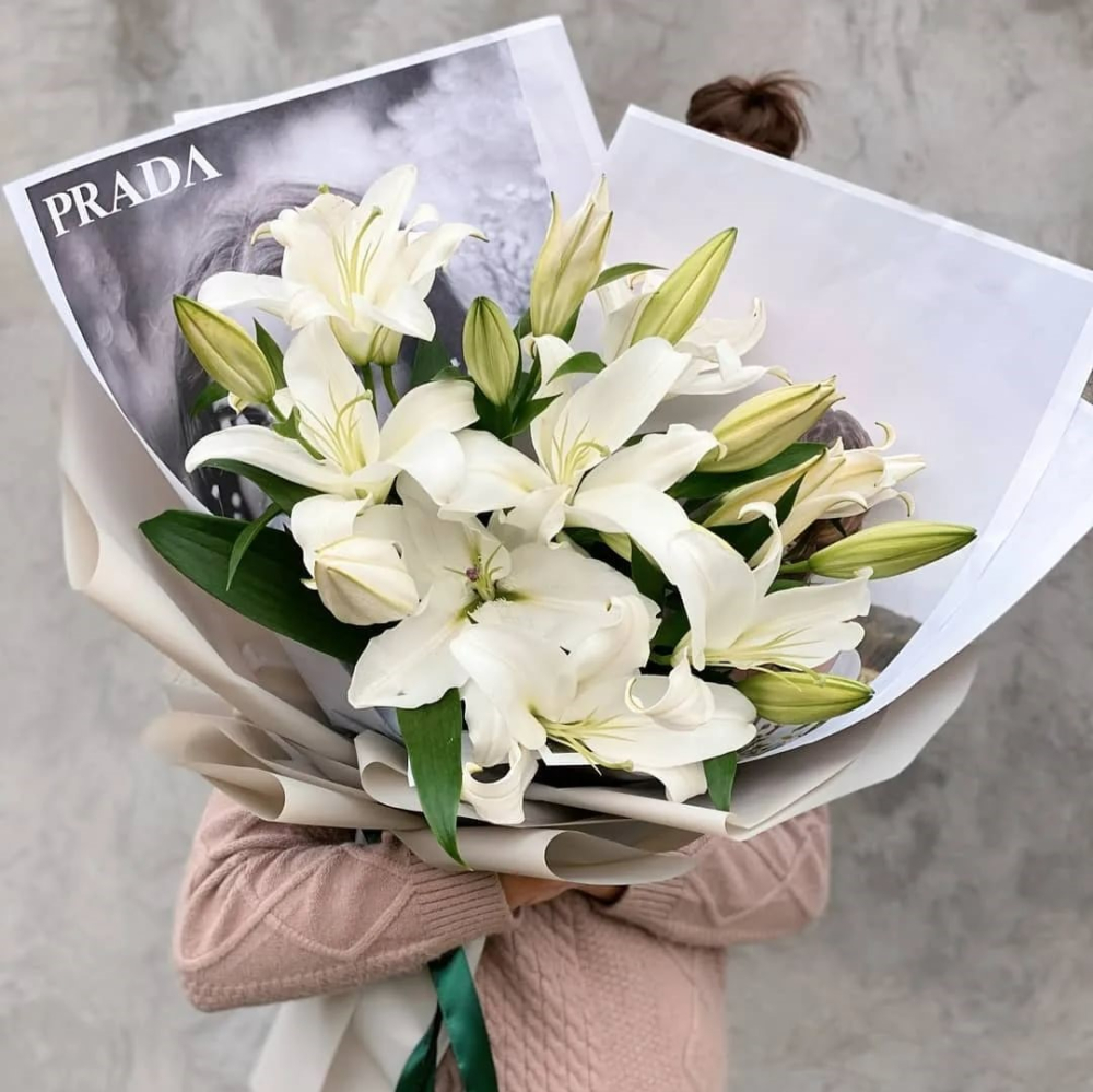 Букет из белых Лилий в дизайнерской упаковке арт. 47543