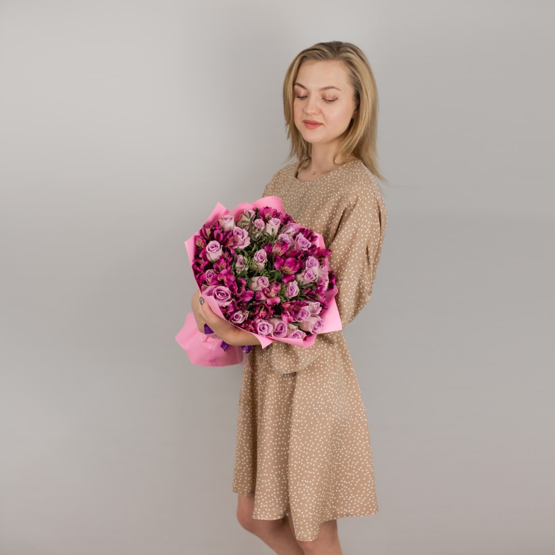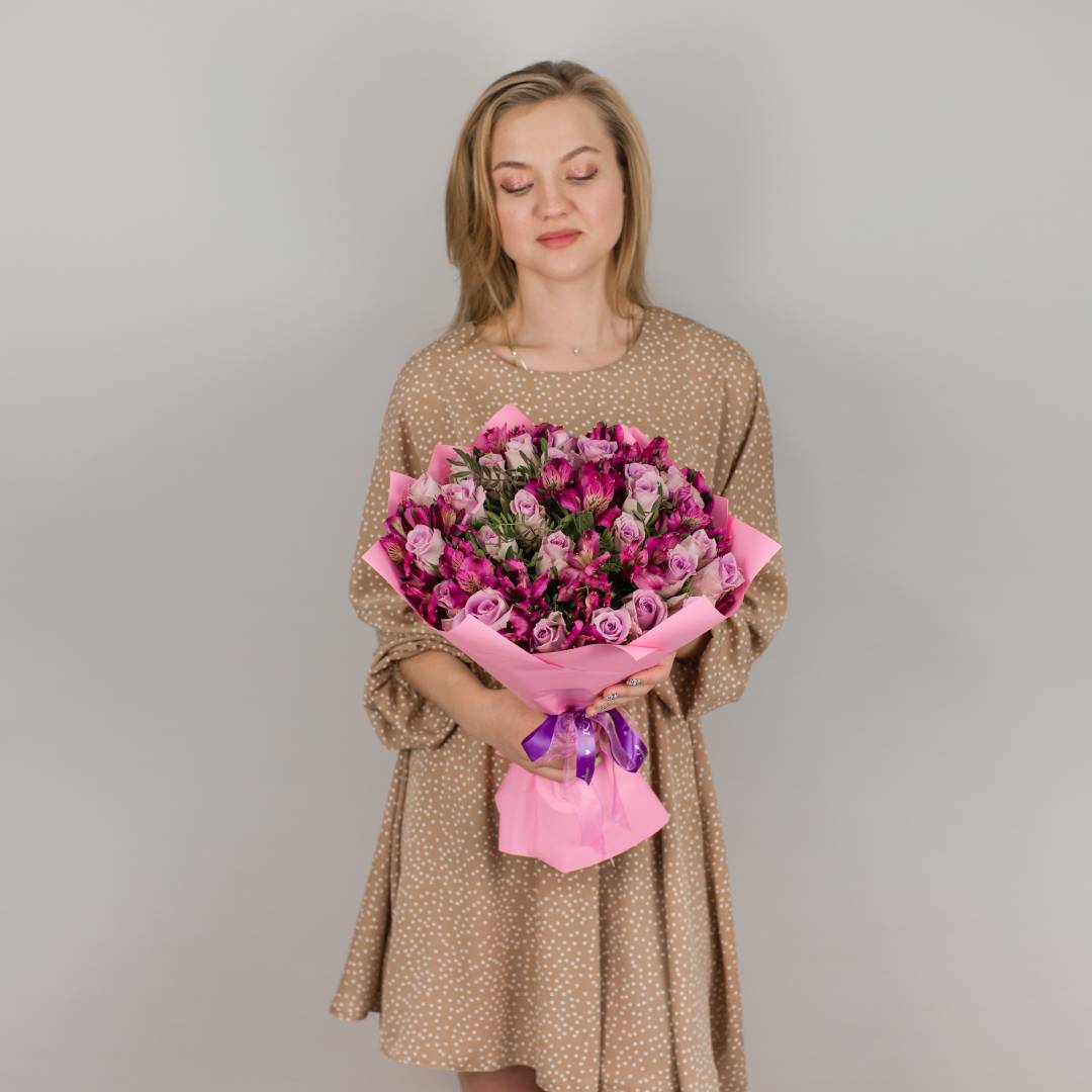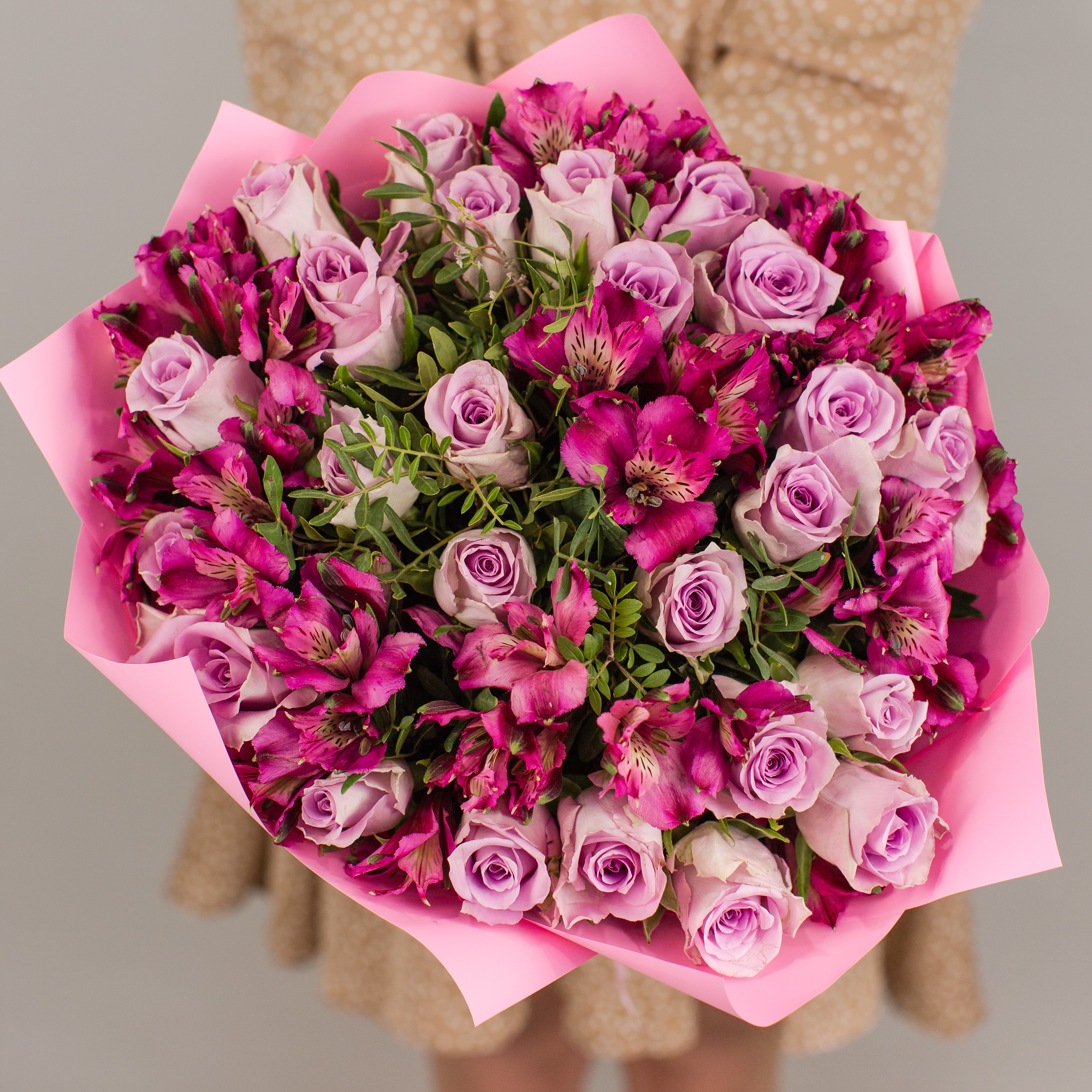 Букет из 25 сиреневых роз Кения и альстромерий арт. 50543