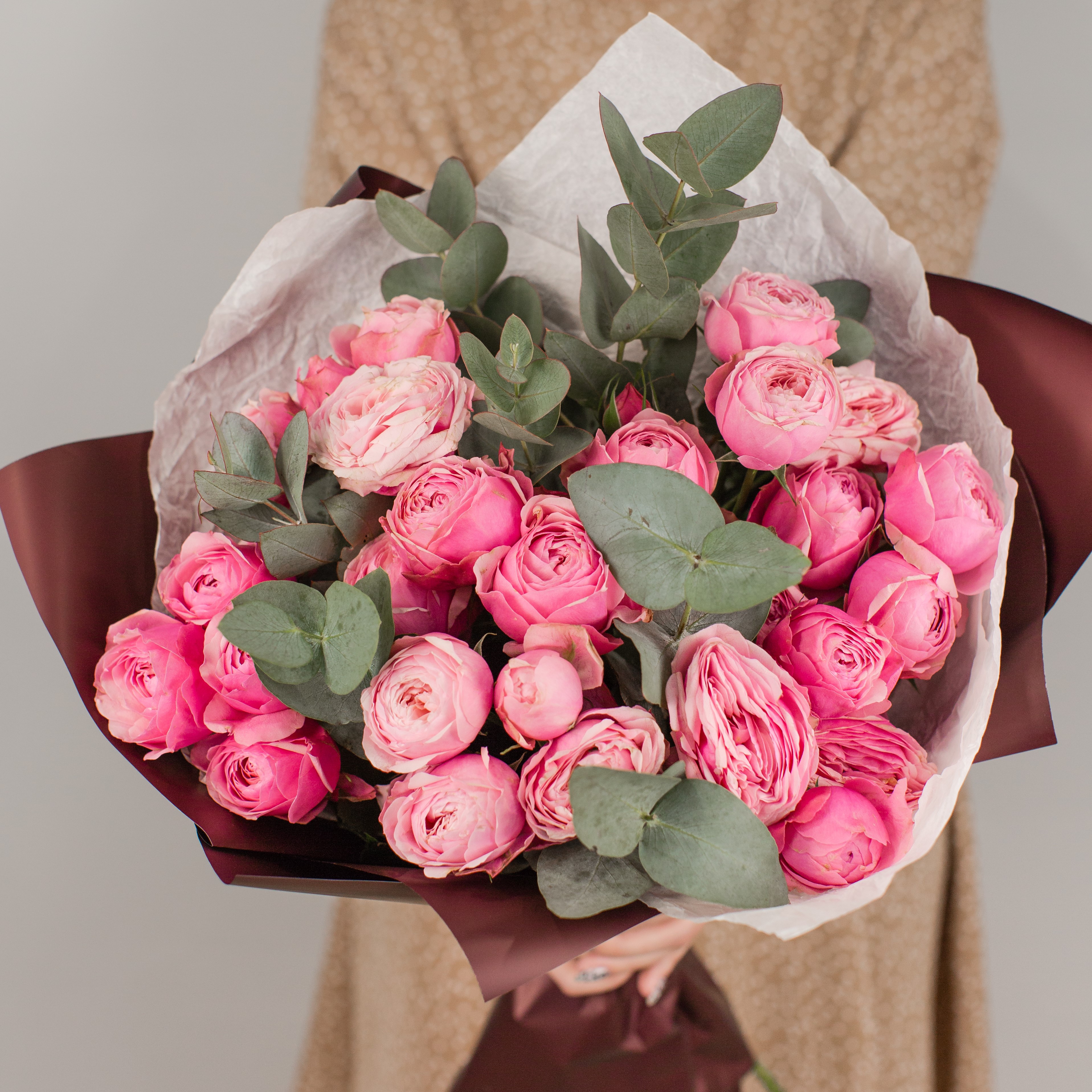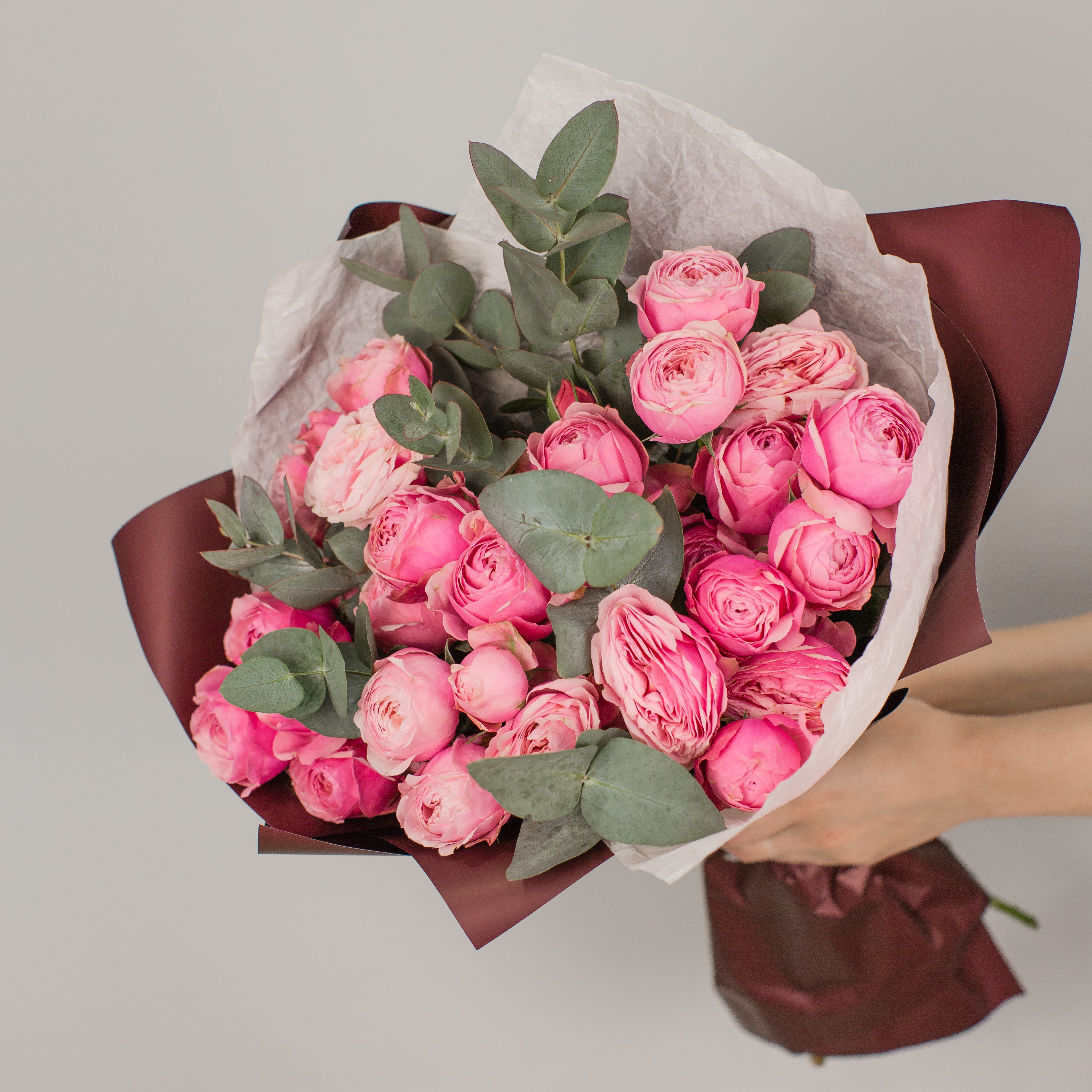 Букет из ярких кустовых пионовидных розовых роз с эвкалиптом арт. 50416