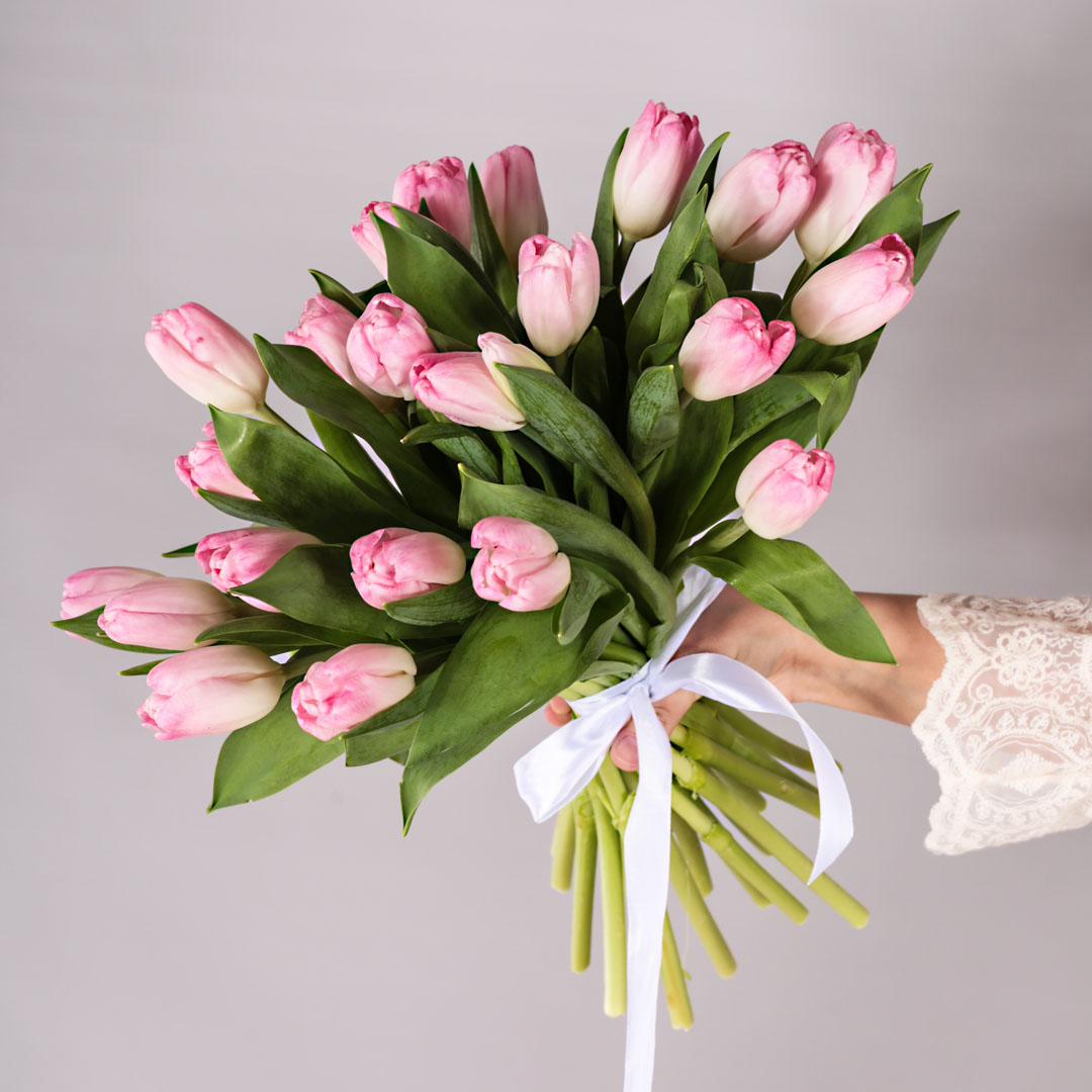 Розовые Тюльпаны 25 шт. МИКС с лентой (без упаковки) арт. 7338