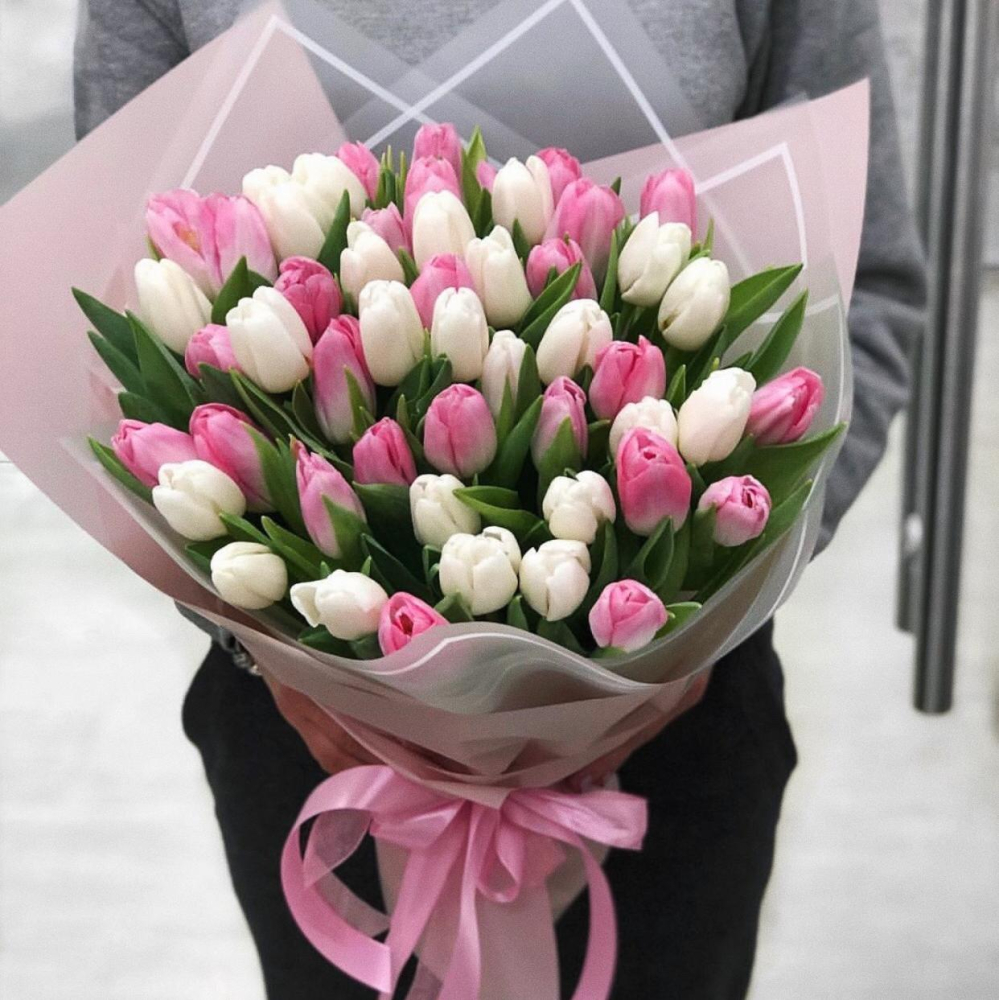Букет из тюльпанов - 51 шт розово-белый в упаковке арт. 7337
