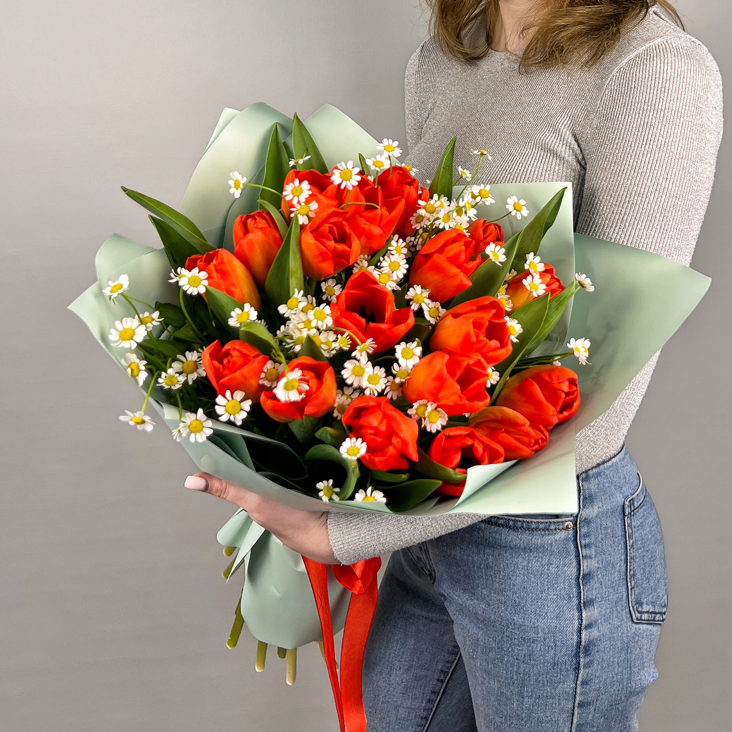Букеты из красных тюльпанов с ромашками для мамы и дочки арт. 46331