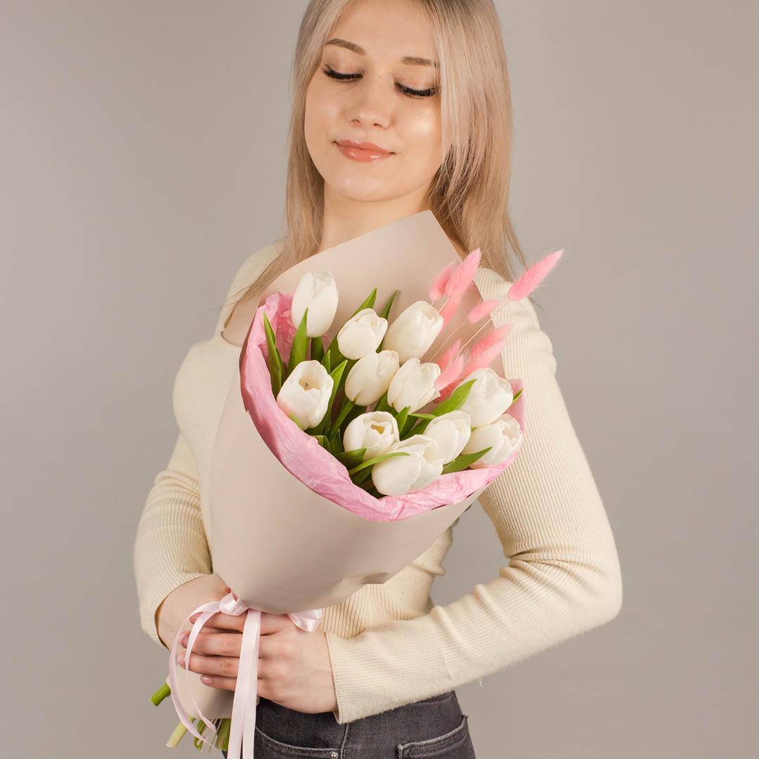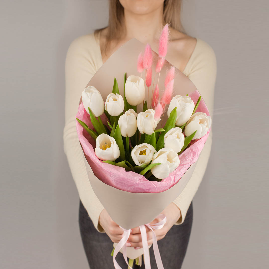 Букет из белых тюльпанов с лагурусом арт. 46462