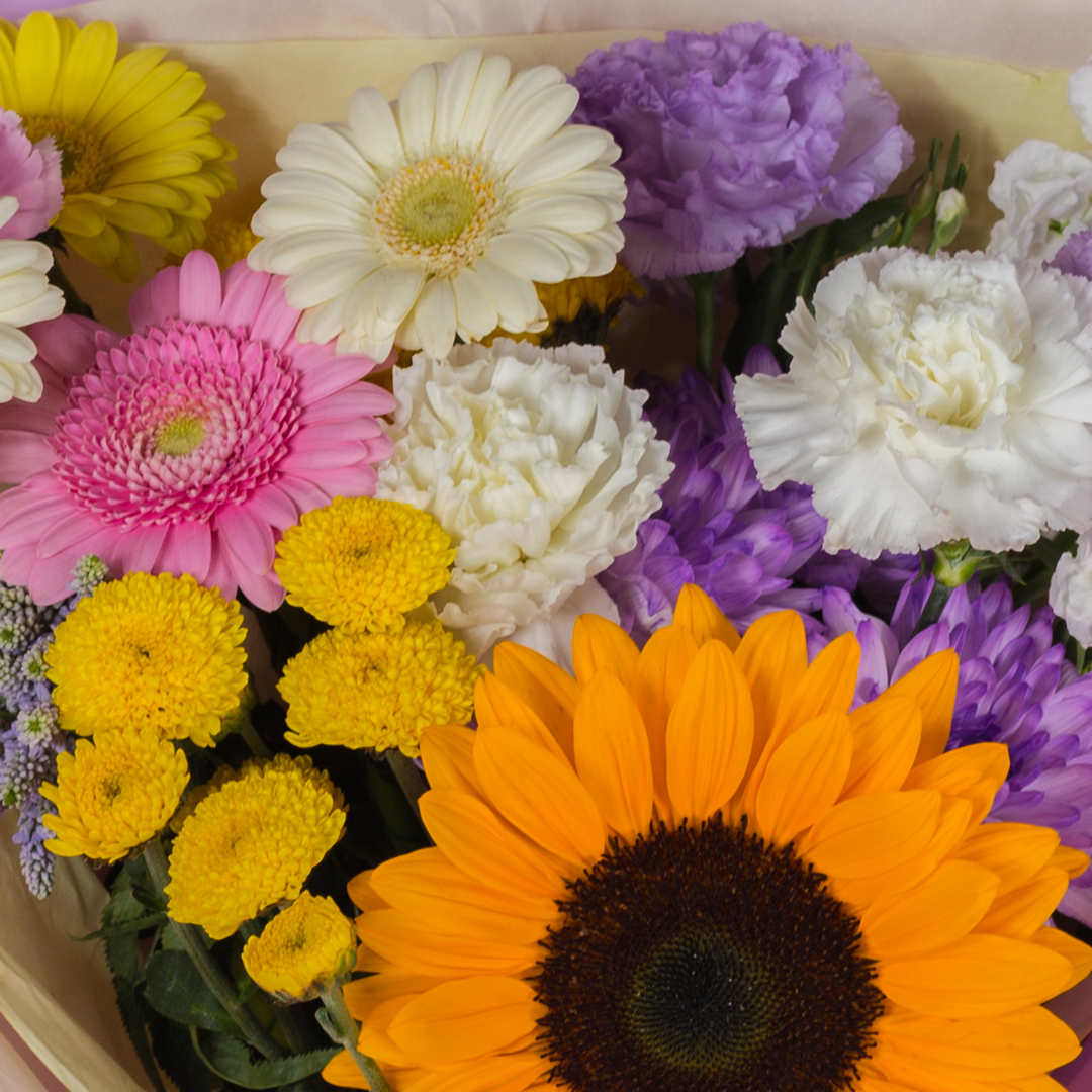 Этот букет на 1 сентября станет прекрасным выбором для школьников средней и старшей школы. Он одинаково уместен как на школьной линейке, так и в роли сюрприза на день рождения или просто так, чтобы порадовать близкого человека. Элегантное сочетание крупных и мелких цветов придаёт композиции необычный и фактурный вид.